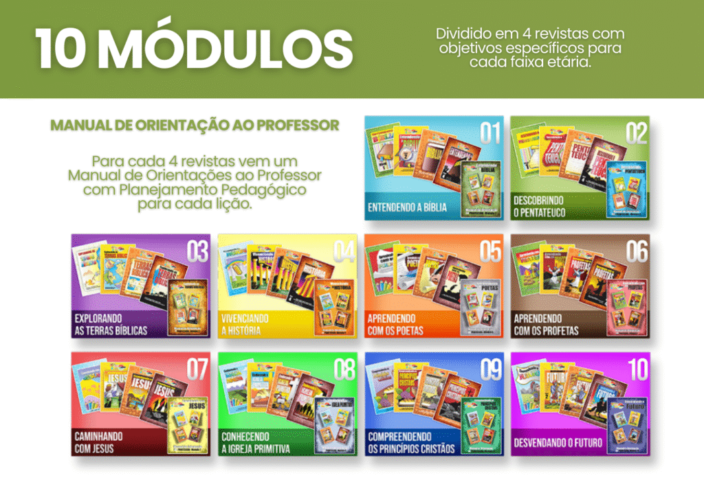 São 10 módulos cobrindo os assuntos principais da teologia voltada para público infanto-juvenil. Cada módulo é replicado em 4 níveis, diferenciando pela faixa etária do aluno e um manual do professor.
